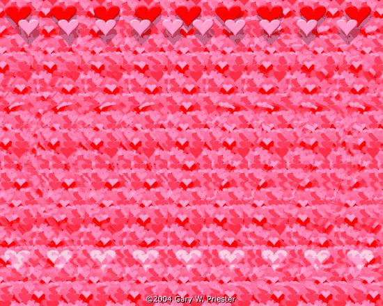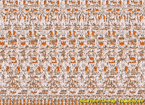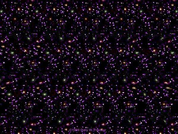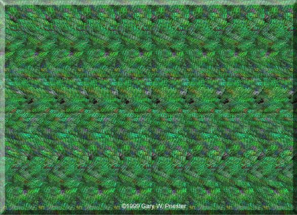Do you know what are stereograms or how to see them? If not, there are some instructions how to see them! believe me, they're excellent! To see stereograms, the user must not look at the paper or screen on which the stereogram lies, but look beyond it. That is, you have to "unfocus" your eyes and stare off into space beyond the stereogram. Unfortunately, beginners always seem to have a horrible time doing this (at least I couldn't see them for months!) So, there are a few techniques you can use. You can get the idea of what you need to do by holding your pointer finger up about a foot or so from your face and stare through it to the wall. You see two fingers, right? That's what you're supposed to do with stereograms. It's a lot of fun to do this with people, staring beyond their heads, and seeing that they really do have four eyes (an affect of this double-vision staring).